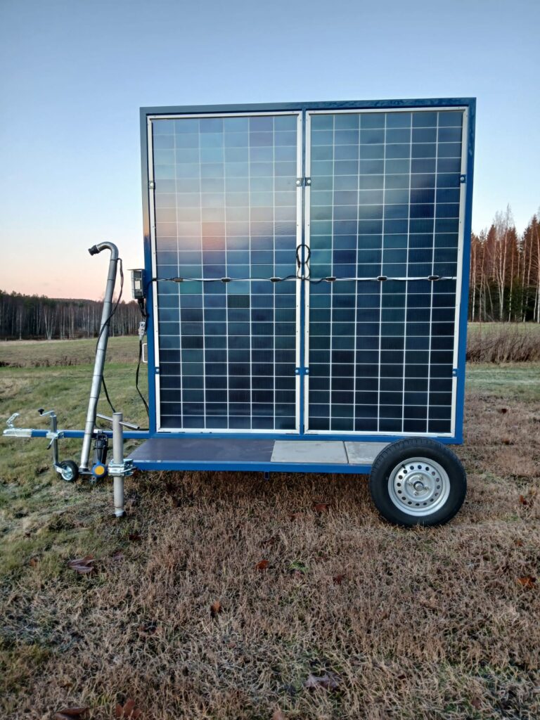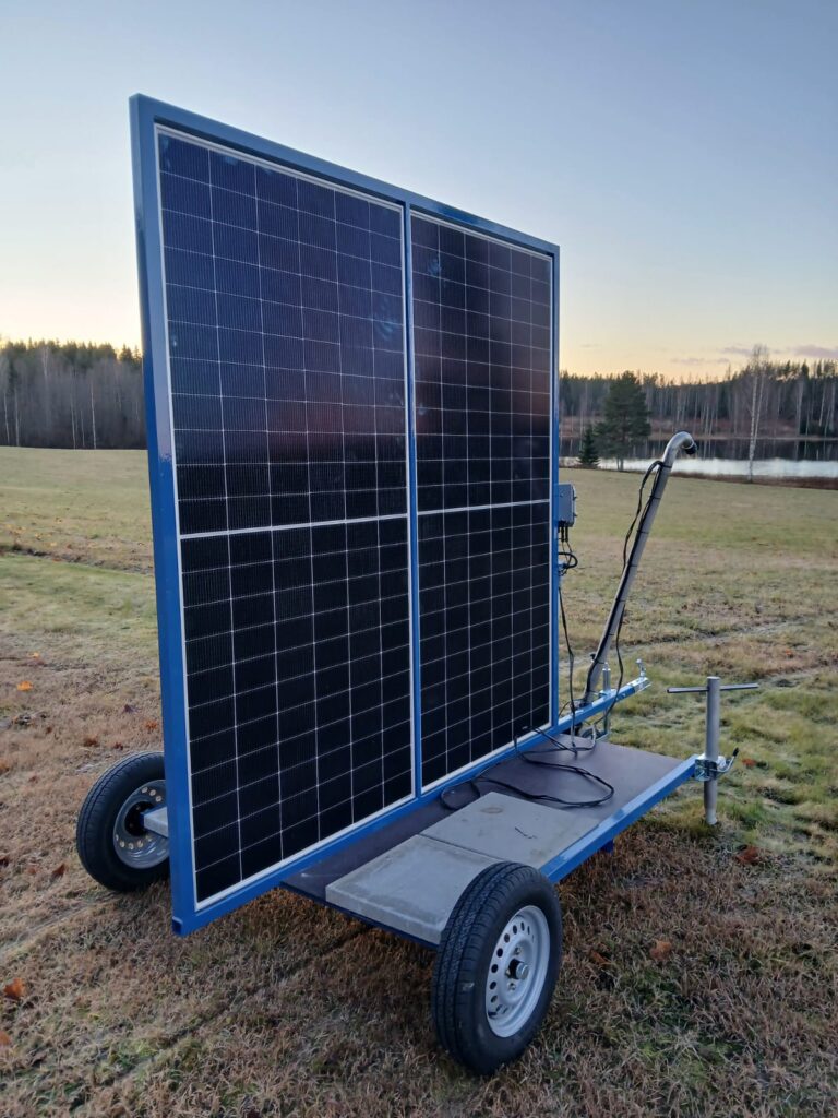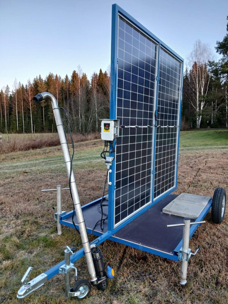Kuivatuspumppaamon aurinkopaneelit voidaan sijoittaa helposti siirrettävään vaunuun . Kaksipuoleinen aurinkopaneeli (bifacial) tuottaa sähköä molemmilta puoliltaan, joten pystyasennossa saadaan aamu- ja ilta-auringon valo hyvin hyödynnettyä. Kaksipuolinen aurinkopaneeli sopii hyvin myös säätökasteluun.