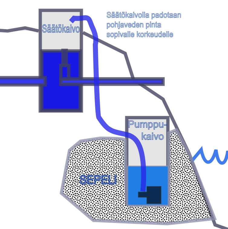 Kastelukaivosta pumpataan vesi säätökaivoon, joka patoaa pellon pohjaveden haluttuun korkeuteen